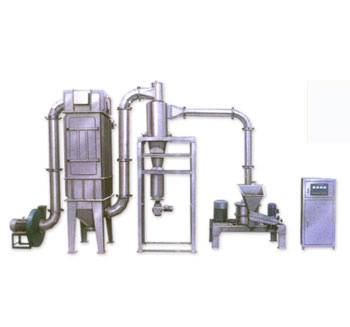 物料由料斗經螺旋輸送器進入粉碎室,被高速旋轉的刀片剪切粉碎,通過負壓風運的方法把物料運入旋風分離器、袋式除塵器、排出物料達到產品的要求。